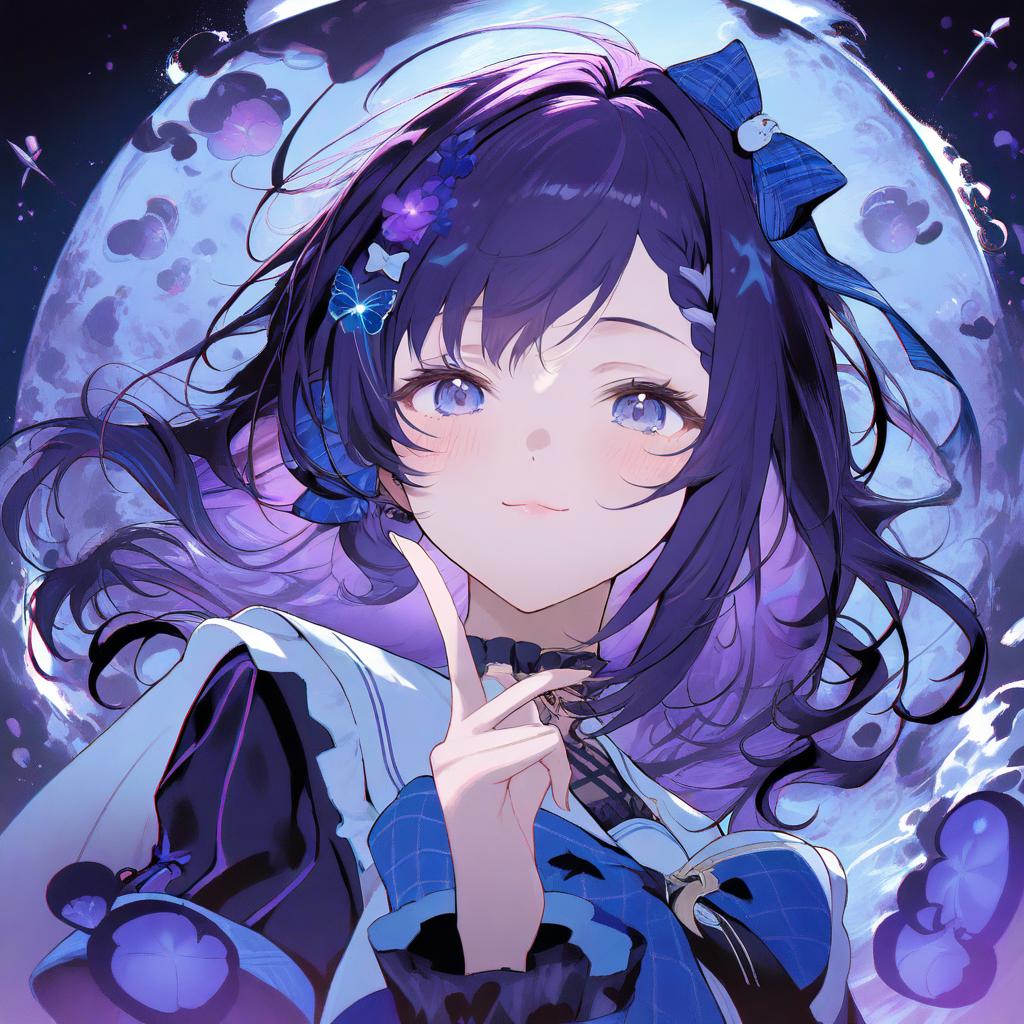 Aiba uiha, nijisanji, 1girl, blue eyes, mole under eye, black hair, long hair, purple hair, hair bow, blue bow, virtual youtuber, virtual youtuber, by artist salmon88, animagine