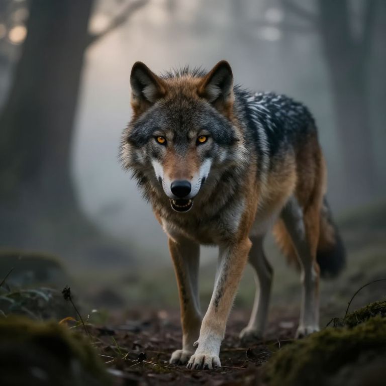 Digital artwork of a fierce, glowing-eyed wolf with brown and gray fur, standing on a misty forest path, background blurred.