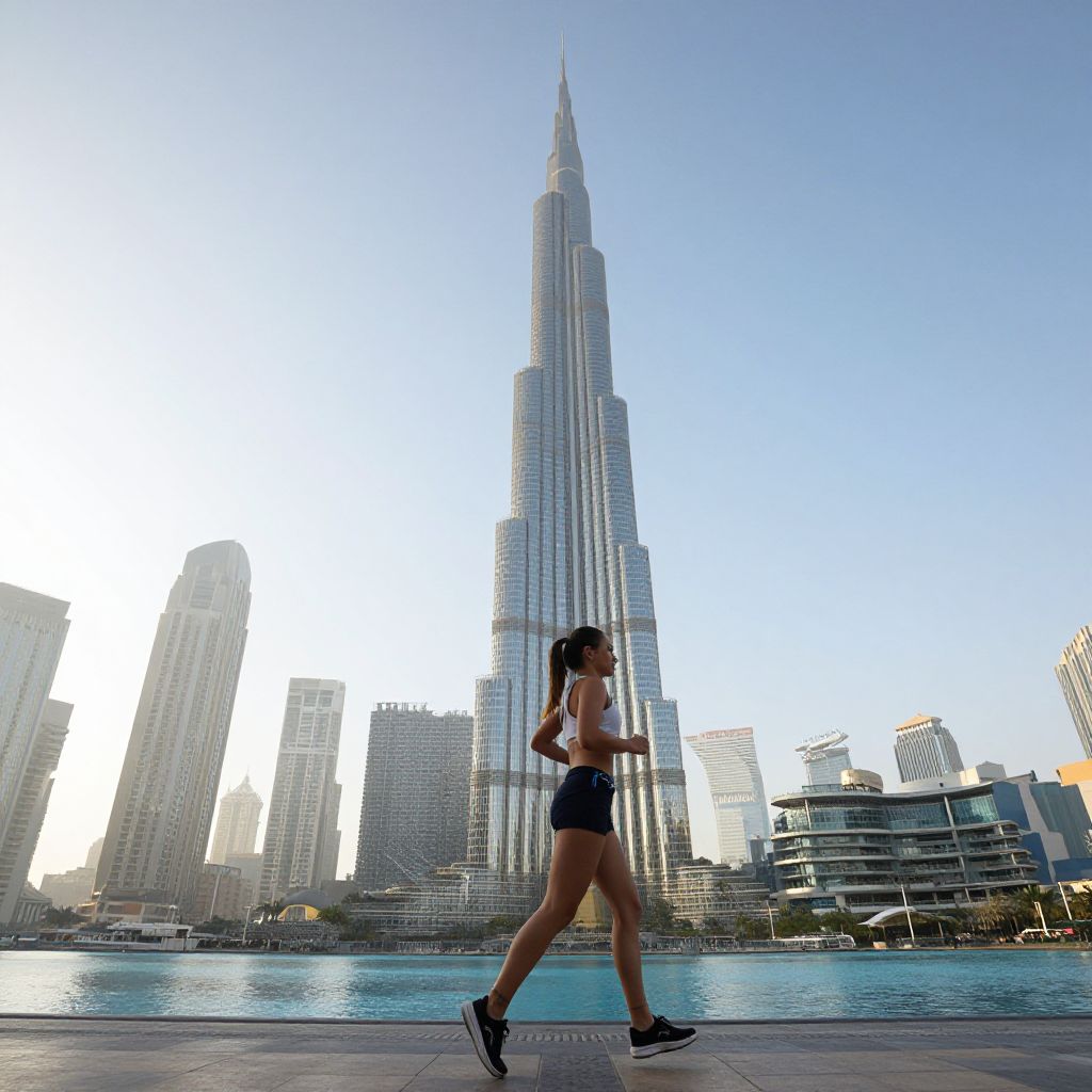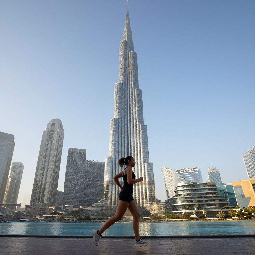 Woman jogging gracefully past the towering Burj Khalifa and the vibrant downtown skyline in Dubai, United Arab Emirates, on a clear morning.