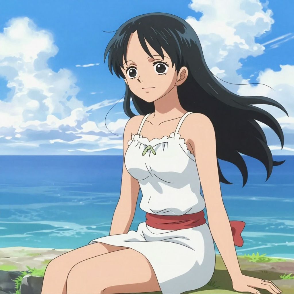Anime-style digital drawing of a smiling woman with long black hair, wearing a white sundress, sitting on a beach with a blue sky and ocean in