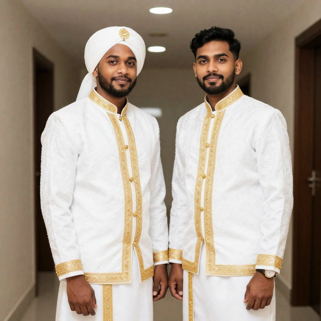 Marriage Costume Gents, dressed in a white and gold outfit standing in a hallway