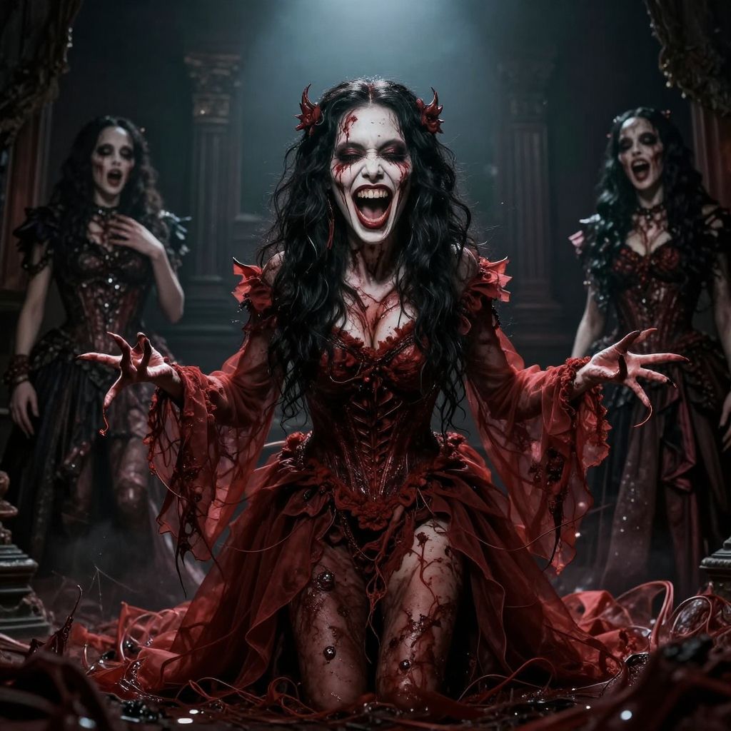 Photograph-style digital artwork depicting a dark, gothic scene. A central female figure with pale skin, long black wavy hair, and red devil horns kneels, wearing a tattered, blood-stained red dress with black lace details. Her face is grotesquely pale with red blood smeared across it, and she has an open-mouthed, menacing grin. Her arms are outstretched. Two other female figures in similar blood-stained red dresses with black lace and horns stand in the background, also with pale skin and blood on their faces, appearing to be in a state of eerie excitement. The background is dimly lit with dark, ornate architecture.