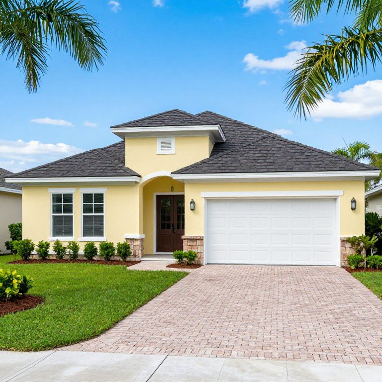 Sunny residential single-family home at 2827 Ponte Vedra, Ponte Vedra Beach, Florida 32082, featuring a light yellow exterior, dark shingle roof, arched front entrance with double doors, three bedrooms, two bathrooms, and a well-maintained brick driveway leading to a white garage door, surrounded by lush green landscaping and a clear blue sky.