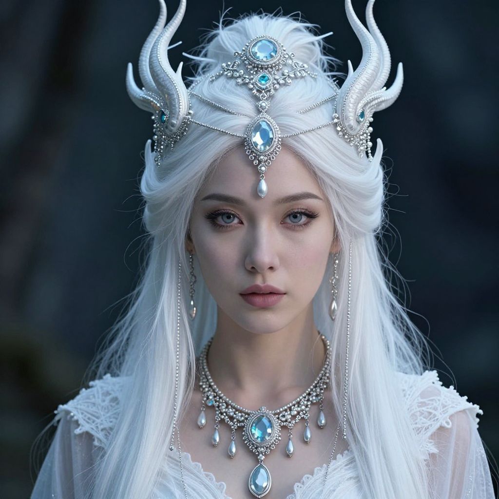 A woman with intricate headpiece and jewelry, resembling a white witch, in a fantasy setting.