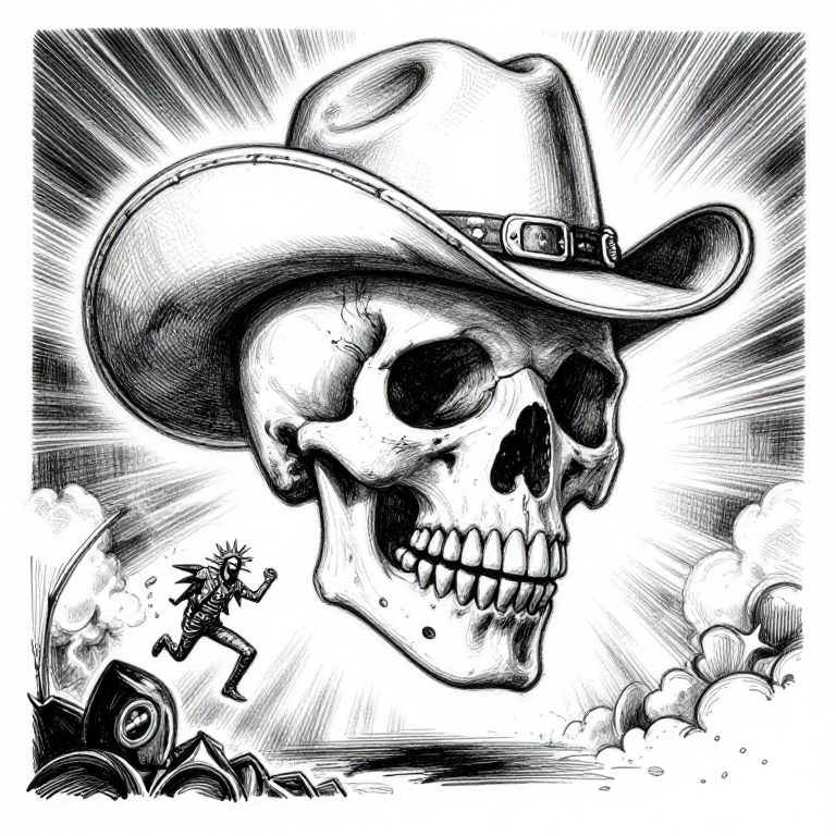 A black-and-white digital ink drawing features a large, detailed skull wearing a cowboy hat with a buckle, radiating dramatic lines in the background. The skull's teeth are prominently displayed, and its eye sockets are dark and empty. In the lower left corner, a small, dynamic figure dressed in a sheriff's outfit is depicted in a running stance, pointing at the skull. At the bottom, there are fragmented, explosive shapes. The overall style is reminiscent of comic book art, with strong contrasts and dynamic lines.