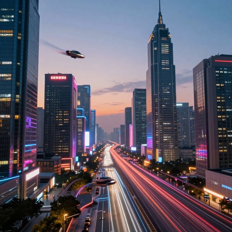 Photograph of a futuristic cityscape at dusk, featuring tall skyscrapers with neon lights, a flying drone, and long light trails from moving cars