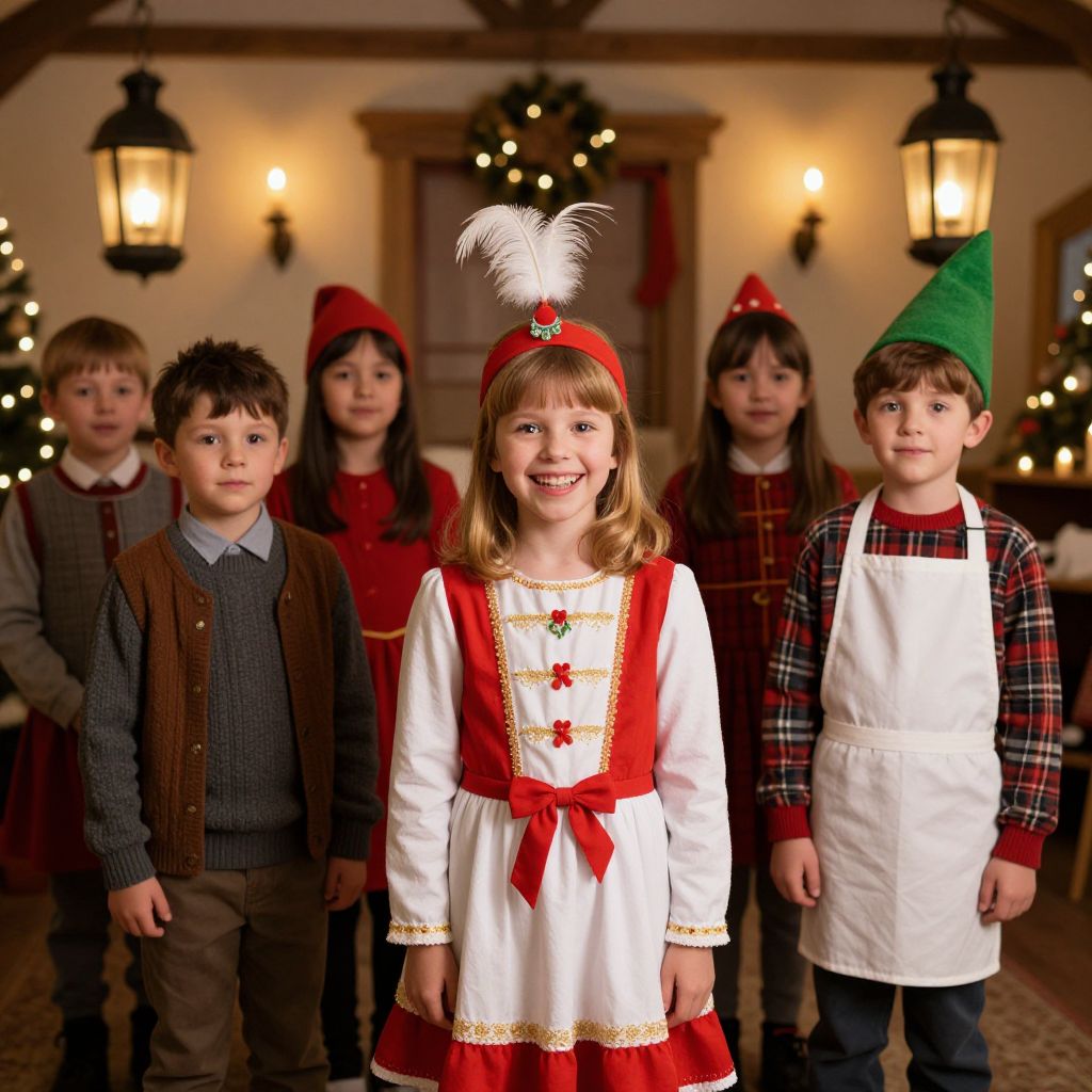 A group of children in various nursery rhyme costumes gathered around a festive village hall with lanterns and Christmas-inspired décor, one child in a red and white dress with a feathered headdress and a wide, bright smile, another in a green hat and apron, all standing in a warm, candlelit room with soft focus on their expressions.