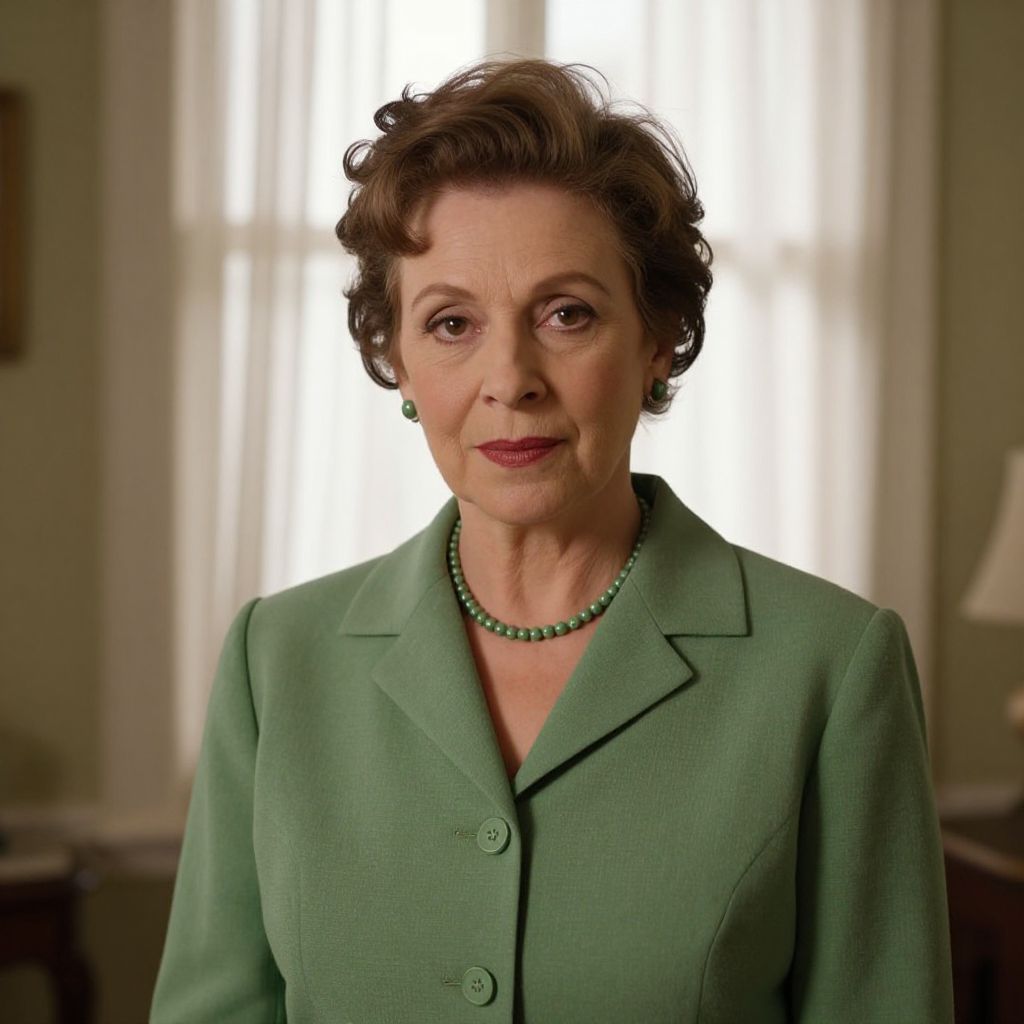 The image depicts a 50-year-old woman with short, symmetrical hair styled in a vintage fashion, reminiscent of the 1950s. She is wearing a green blazer with a buttoned front and a matching green necklace. Her earrings are small and round, adding a subtle touch to her attire. The background features a window with white curtains, allowing natural light to filter into the room, casting soft shadows and highlighting the woman's features. The overall composition is centered, with the woman's face and upper body occupying the majority of the frame. The lighting and color palette evoke a warm, nostalgic atmosphere, suggesting a portrait inspired by the works of Austin Briggs.