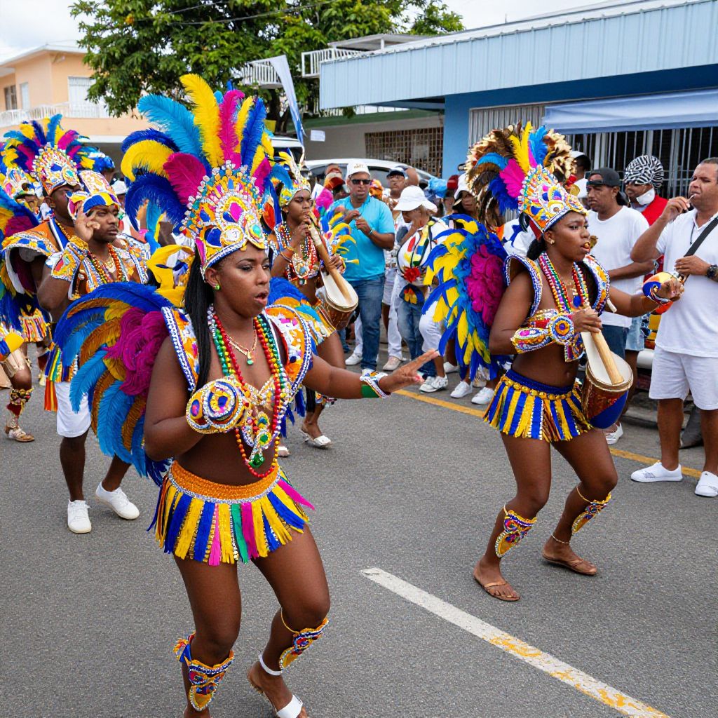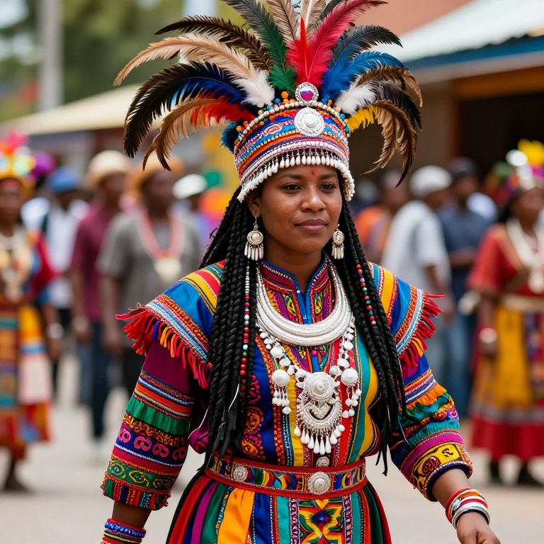 A vibrant and dynamic person is wearing a colorful, intricately designed outfit that blends bold patterns and vivid hues, with a large, ornate headpiece adorned with feathers, beads, and metallic accents, adding a striking and expressive touch to their appearance. The person stands confidently in a lively setting, exuding energy and cultural richness, with sunlight gently illuminating their features and the surrounding environment.