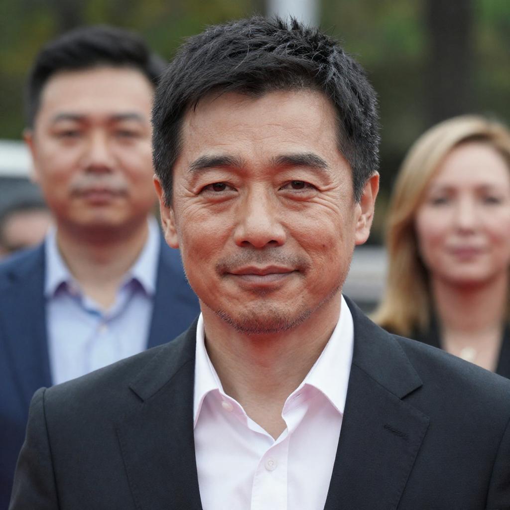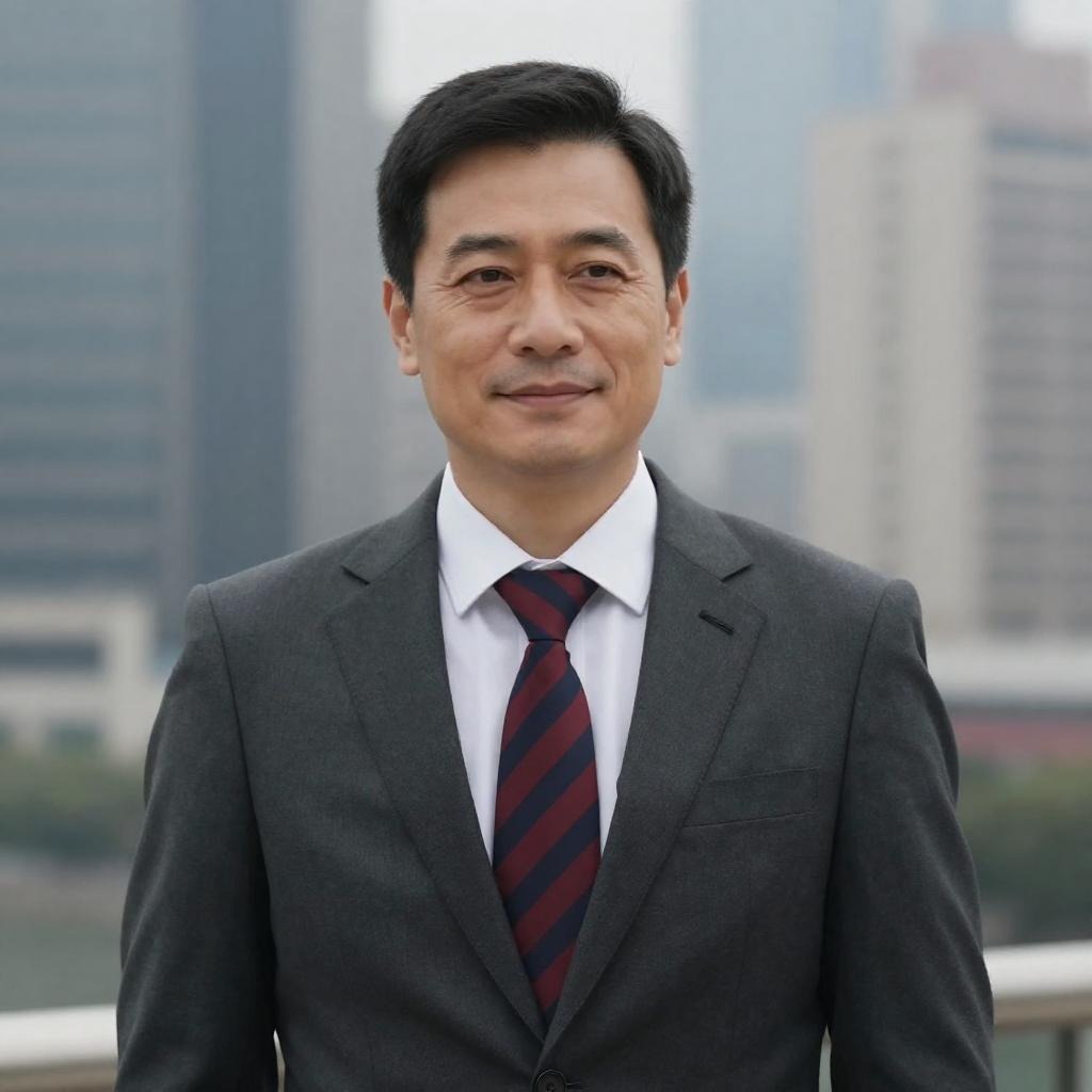 Photograph of a middle-aged man with short dark hair, wearing a dark gray suit, white shirt, and red striped tie. He has a slight smile and is looking to the side. Background is a blurred cityscape with tall buildings and lights. Man is centered in the frame.