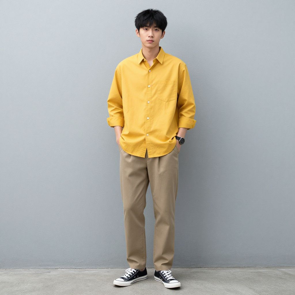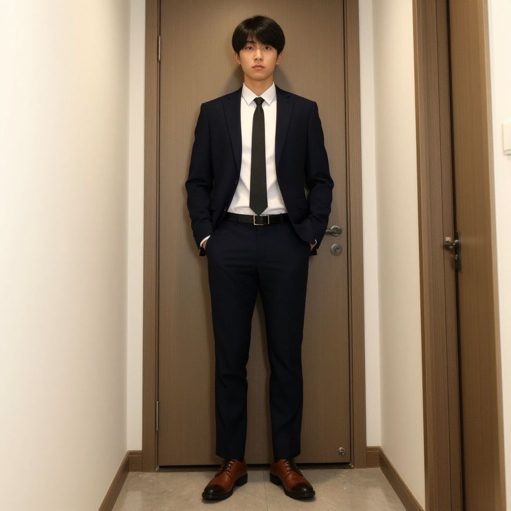 "series costume, 1boy, male focus, solo, black hair, full body, standing, black footwear, own hands together, realistic, shoes, long sleeves, closed mouth, looking at viewer Realistic photo of casual sexy person with pretty face"