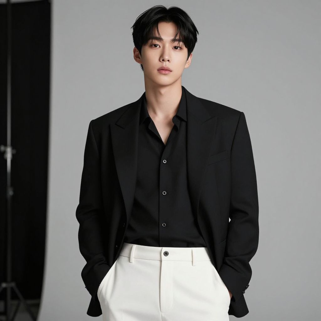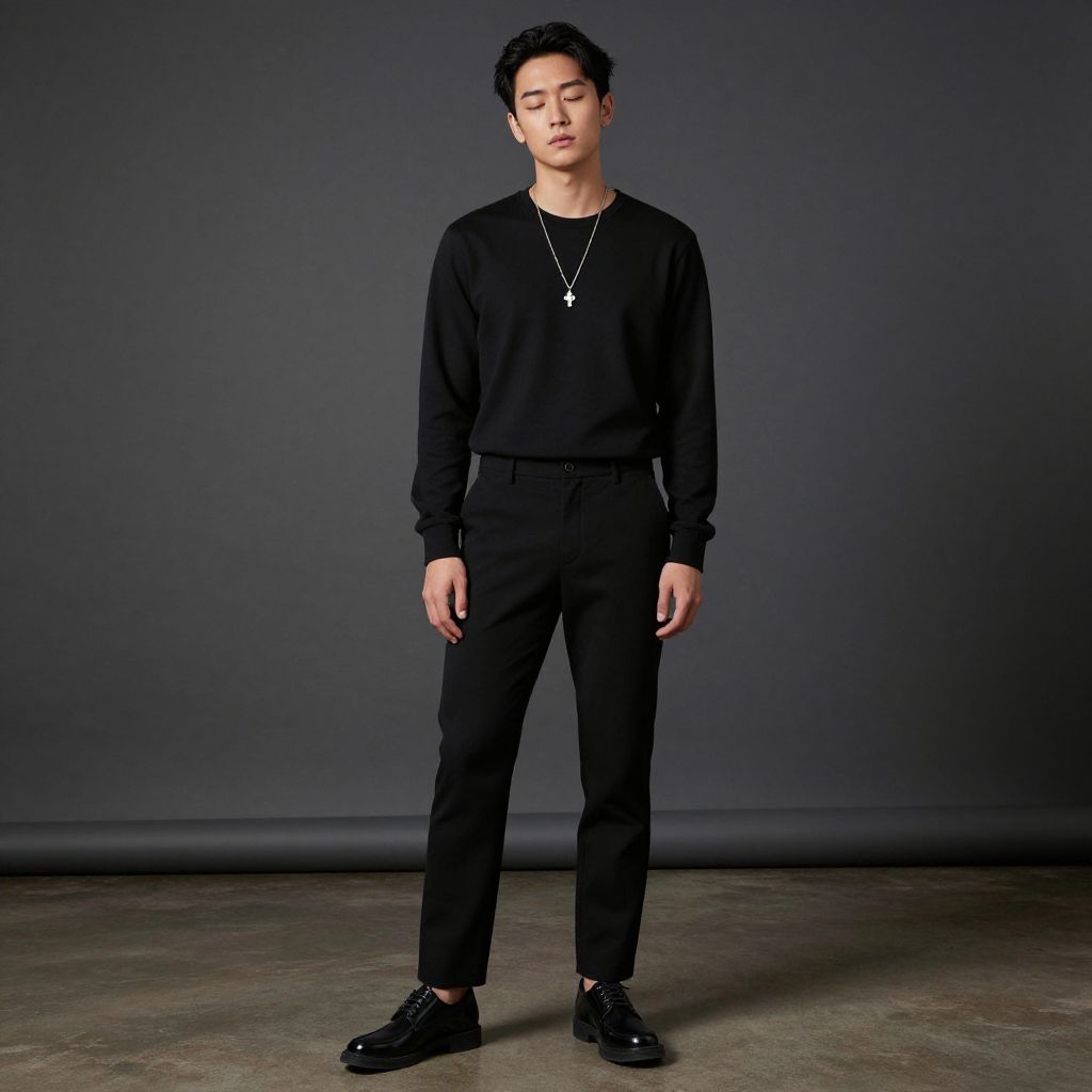 Photograph of an East Asian man with short black hair, wearing a black long-sleeve shirt, black pants, and black shoes, standing against