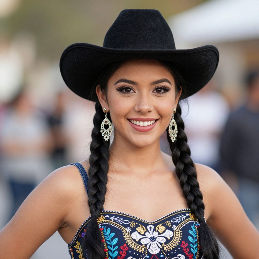 Photograph of a young Latina woman with medium-brown skin and long black hair in two braids. She wears a black wide-brimmed hat, ornate black dress with colorful embroidery, and dangling silver earrings. Her smile reveals white teeth, and she has dark, arched eyebrows and subtle makeup. The background is blurred, showing an outdoor setting with indistinct people and greenery. The image focuses on her upper body and face, emphasizing her traditional attire and confident demeanor. The lighting is natural, highlighting her features and the intricate details of her dress.