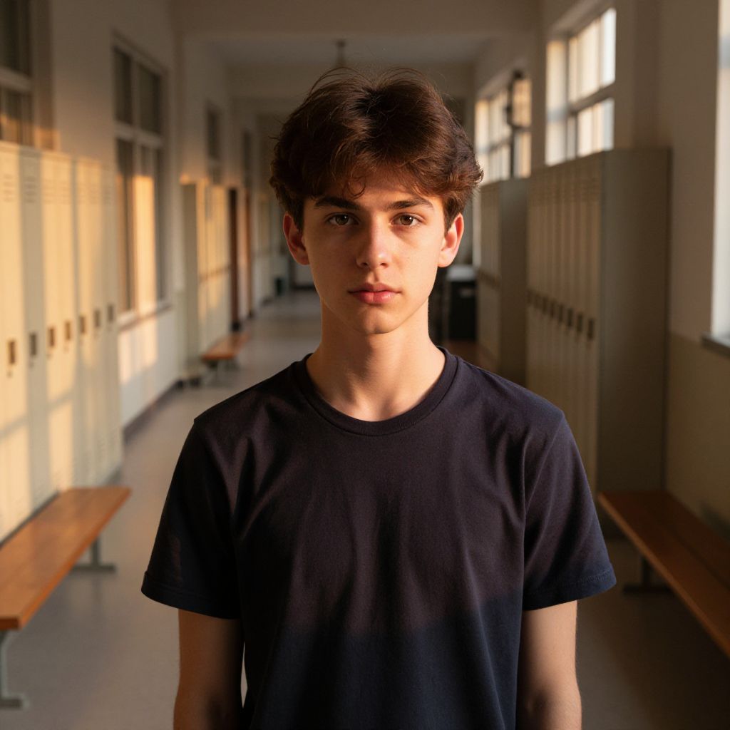 A single boy walking down a quiet city street at dusk, wearing a blue hoodie, looking slightly introspective, neon signs and foggy atmosphere, urban realism, detailed textures, thoughtful expression, cinematic depth.
