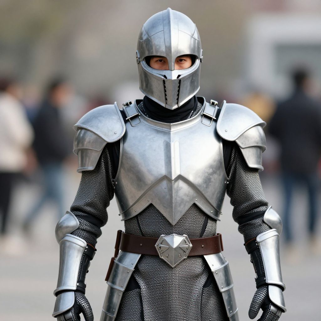 Plastic knight costume, armor, solo, blurry background, blurry, belt, helmet, 1boy, looking at viewer, male focus, gauntlets, breastplate, closed mouth, pauldrons, shoulder armor, chainmail
