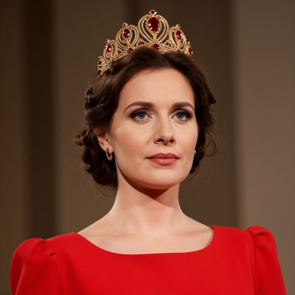 "Soviet Fancy Dress, a close up of a woman in a red dress and a crown"