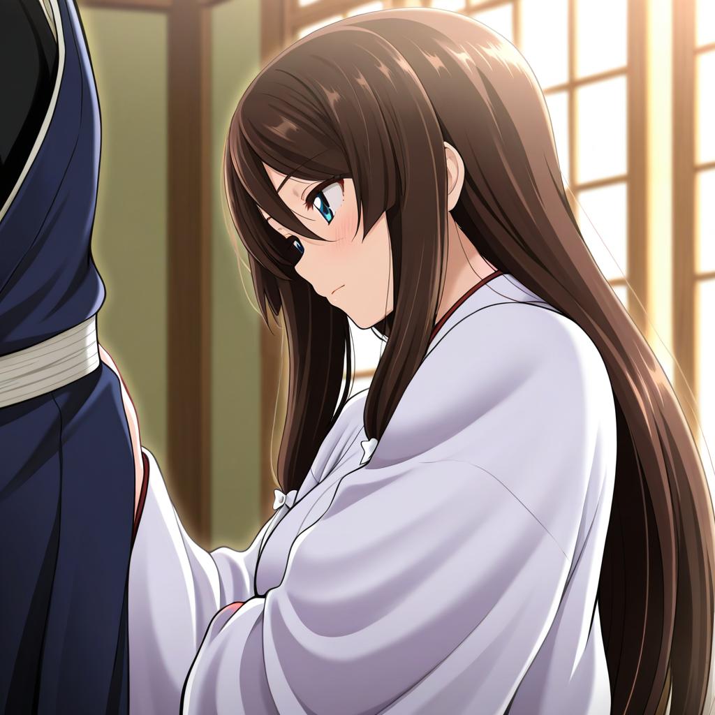 Mutsu-no-kami yoshiyuki, touken ranbu, 1boy, yellow eyes, brown hair, long hair, japanese clothes, japanese clothes, sode, by artist ikari manatsu, illustrious