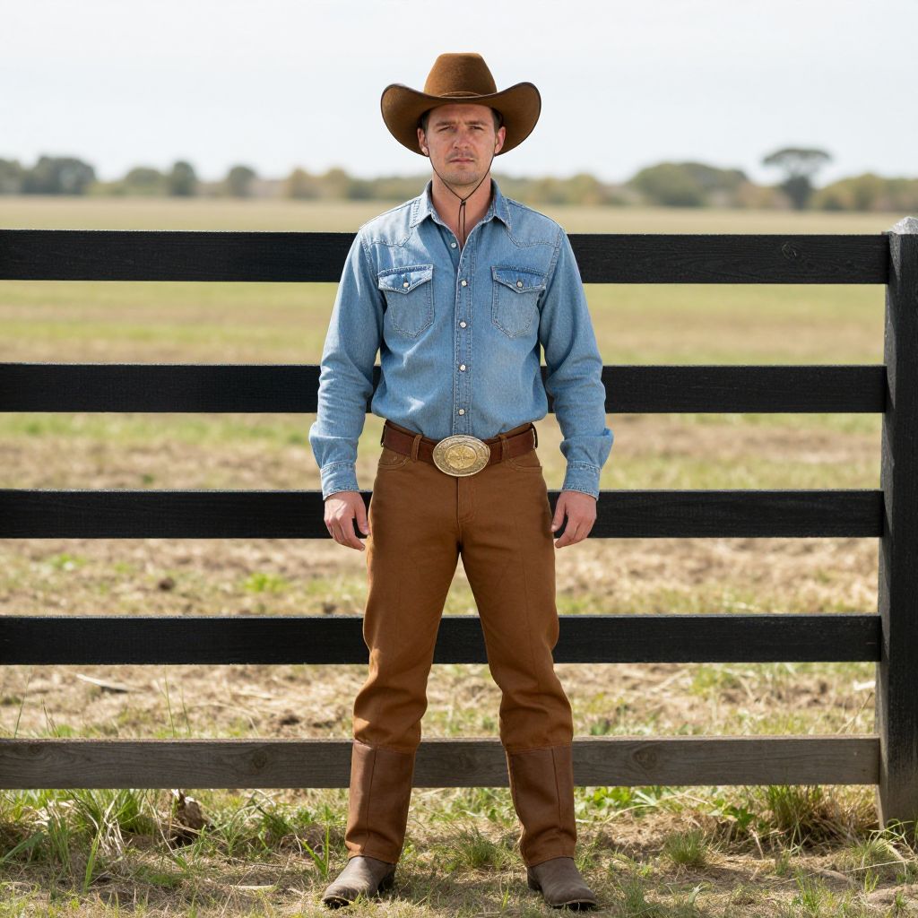 Photograph of a muscular, light-skinned man in a blue denim shirt, brown pants, cowboy hat, and boots, standing confidently in front of