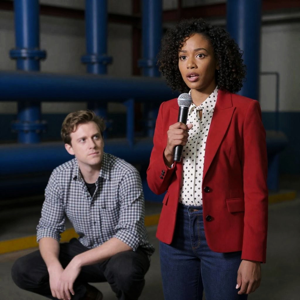 Photograph of two people in a industrial setting. Woman in red blazer and white polka dot shirt holding microphone, looking forward with surprised expression. Man in checkered shirt, crouching, looking to the side. Blue pipes and metal structures in background. Woman's curly black hair, man's short brown hair. Both illuminated with dramatic lighting.