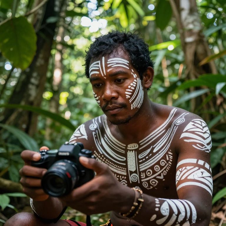 Photograph of a shirtless, dark-skinned man with white tribal face and body paint, holding a camera in a lush, green jungle.