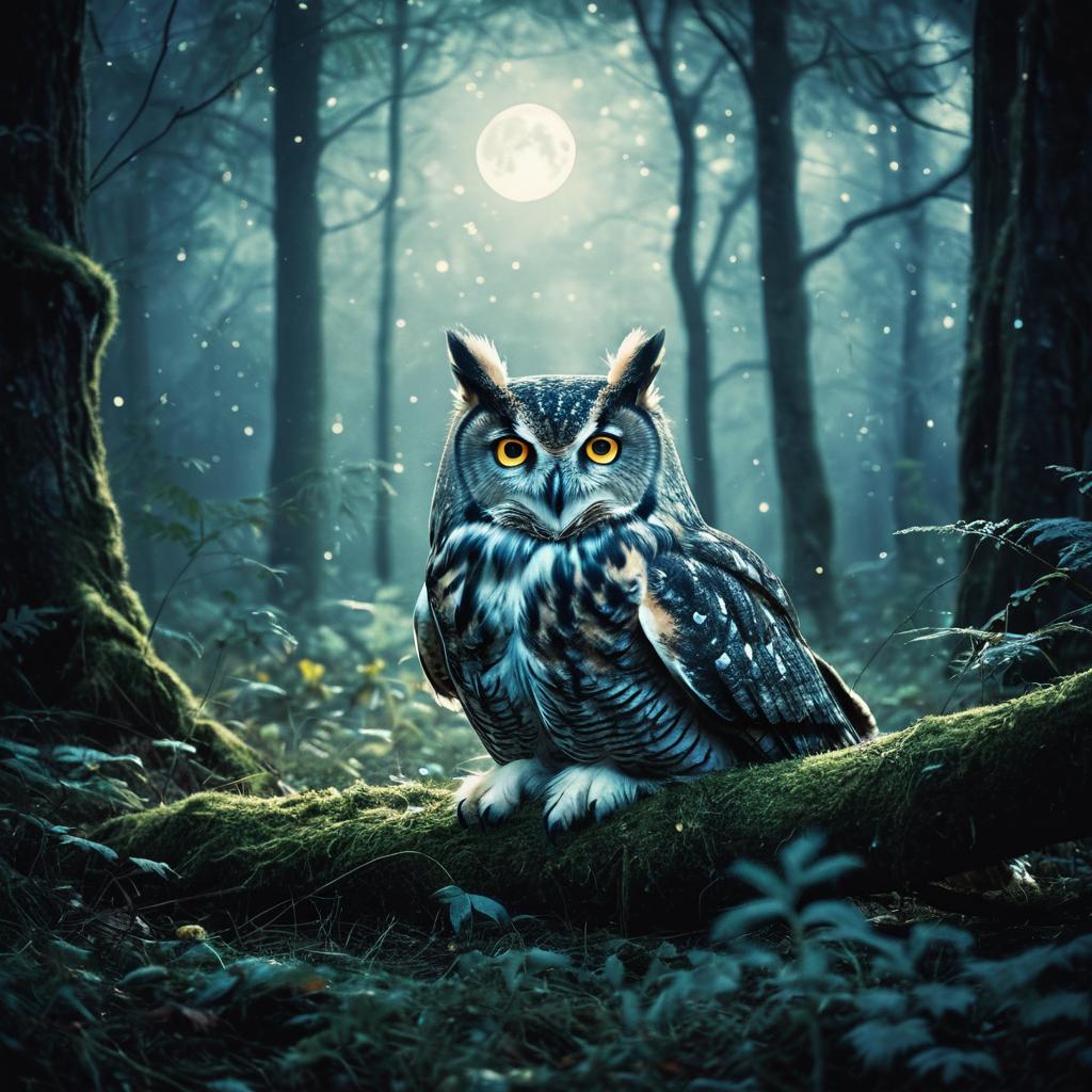 A small, tiny crystal owl with glowing yellow eyes, stands ominously at the end of a chilly, frost-covered glen, silhouetted by sparkling icy blue light, revealing a frozen landscape of twinkling icicles. The mood is magical yet quietly mysterious, as if the fuzzy little monster is deciding whether to spook you or just hang out.