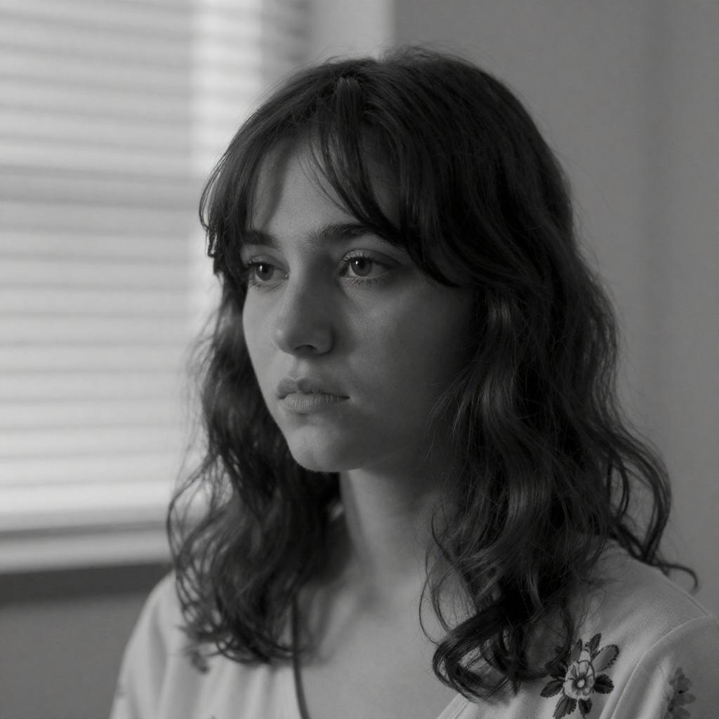 Black and white photograph of a young woman with shoulder-length, wavy dark hair, and bangs. She has a serious expression, looking slightly to the left. She wears a light-colored top with floral patterns on the shoulders. Background includes blurred window blinds.