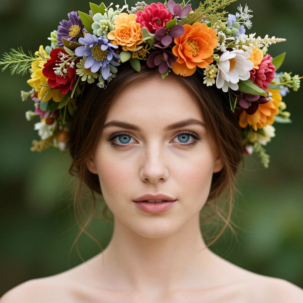 A stunning portrait of a woman adorned with a vibrant floral crown, featuring a blend of colorful flowers and lush greenery in the background. Her captivating blue eyes and soft, natural makeup create a serene and ethereal look, perfectly capturing the essence of beauty in nature.