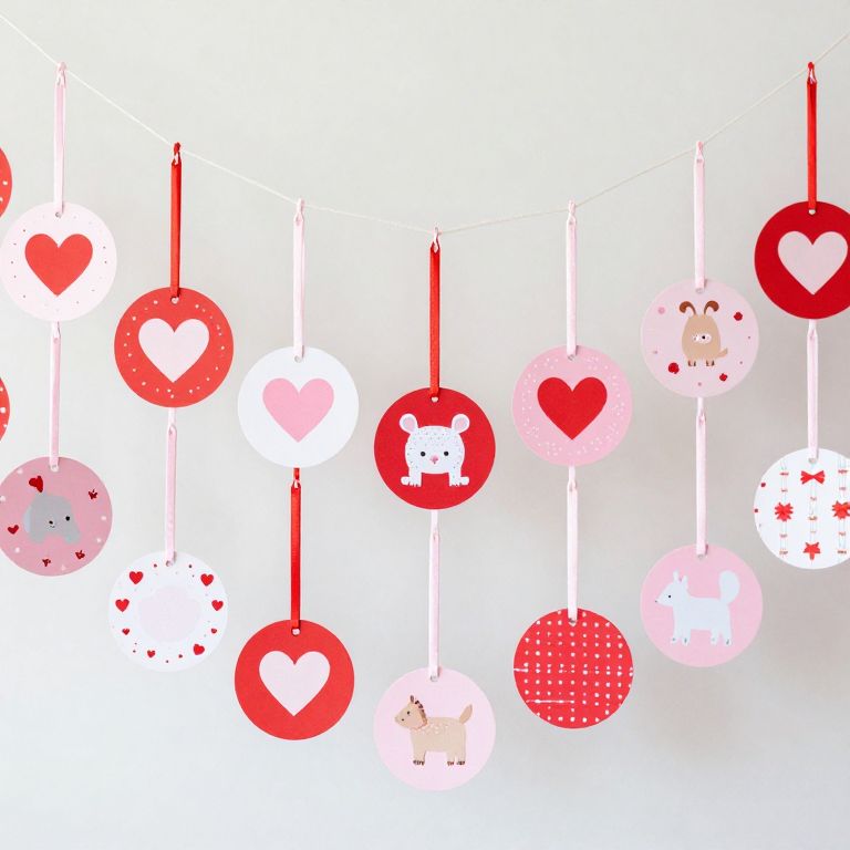 Colorful handmade decorations for a baby shower hang gracefully from strings, featuring circular tags with hearts, animals, patterns, and festive designs in shades of pink, red, and pastel tones, creating a charming and whimsical display.