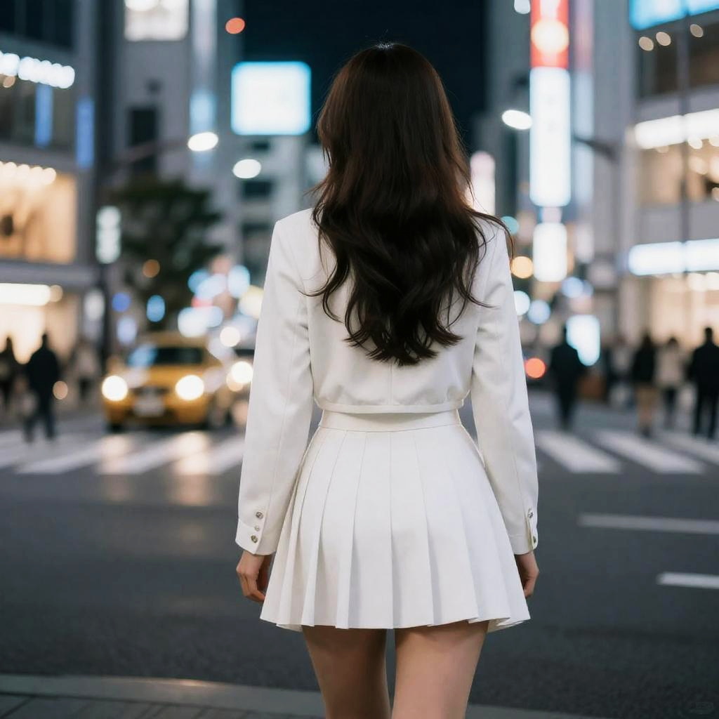 1girl, Tokyo street, night, cityscape, city lights, 8k, RAW photo, best quality, masterpiece, realistic, photo-realistic, from behind, white pleated skirt, jacket, perfect round ass, long hair