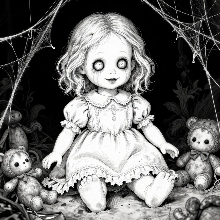 Horror line art featuring a haunted doll with cracked porcelain and hollow eyes, delicate yet disturbing linework portraying its worn dress and eerie smile, surrounded by cobwebs and faded toys, unsettling and creepy detailed illustration.