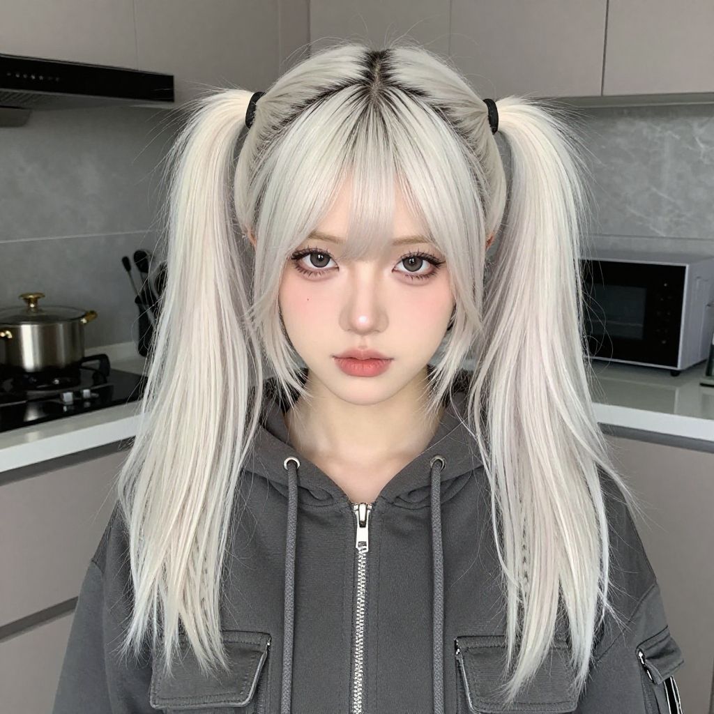 1girl, face focus, platinum hair, medium hair, flipped hair, quad tails hair, parted bangs bangs, hoodie cargo pants chain, gothic kitchen