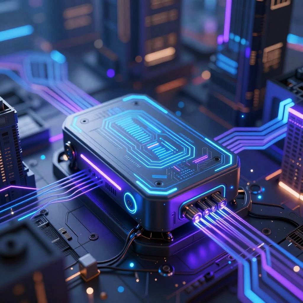 Futuristic AI Expander Device with Neon Circuits