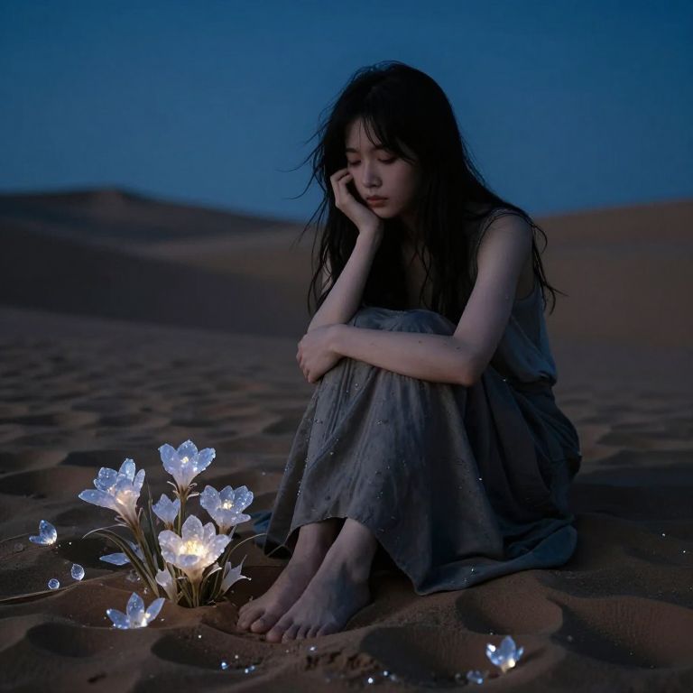 Photograph of a young woman with long, wet, black hair sitting in a dark, desert-like landscape at twilight. She is dressed in a sleeveless, gray, loose-fitting dress and sits with her knees drawn up, resting her head on her hand. Her expression is pensive and melancholic. In the foreground, glowing white flowers with illuminated petals are scattered on the sand, casting a soft light. The sky is a deep blue, and the sand dunes in the background are barely visible in the dim light. Her bare feet are planted in the sand, adding to the serene yet somber mood.