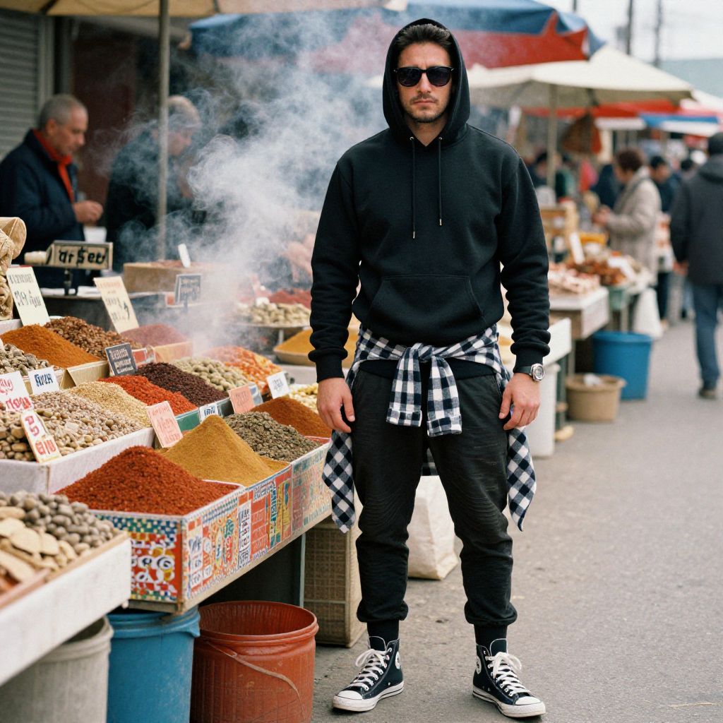 A man, longline black hoodie, checkered flannel shirt tied around waist, tapered jogger pants, high-top canvas sneakers, dark sunglasses, vibrant street market, colorful stalls, aromatic spices wafting, kodachrome analog film, confident expression. Man has masculine face and piercing eyes