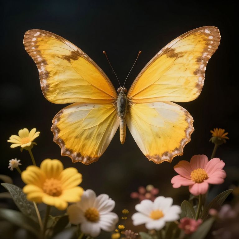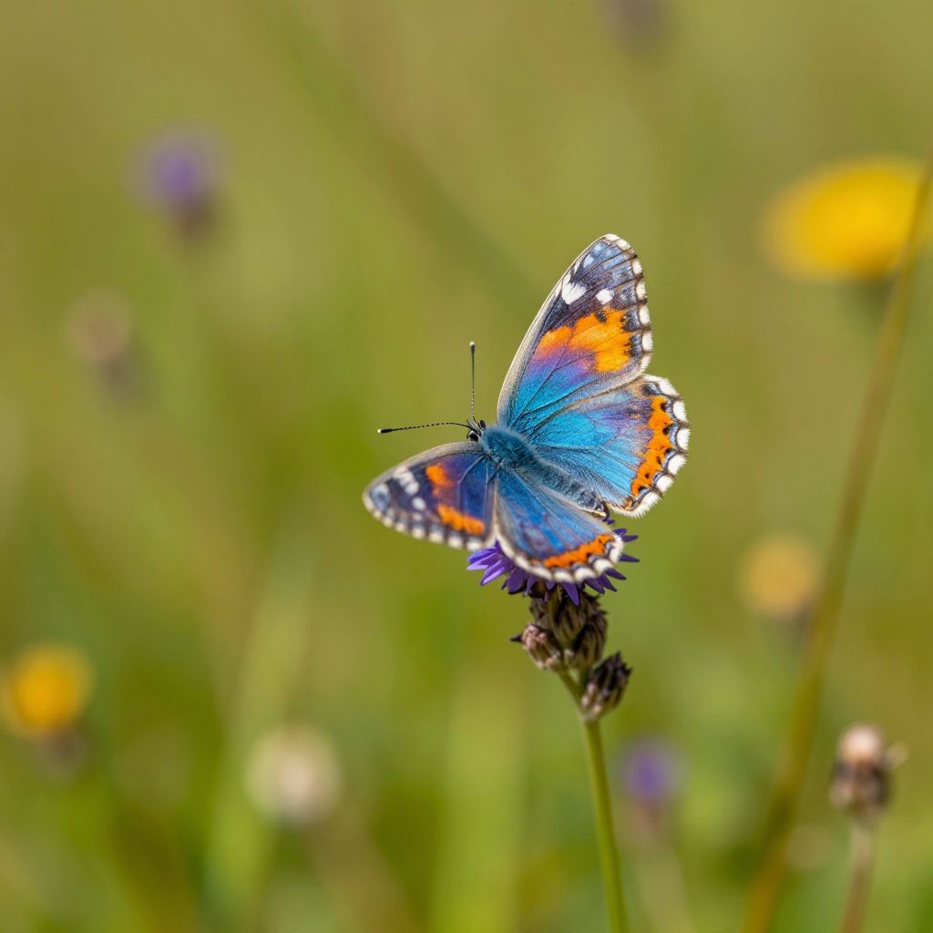 Close-up of a single micado perched on a glossy leaf, intricate wing patterns visible, with droplets of morning dew and blurred vibrant foliage, macro nature photography style.