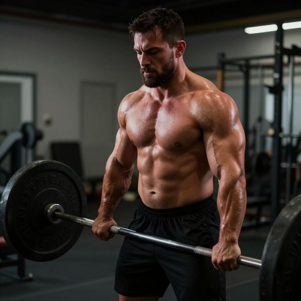 Photograph of a young, fit, Asian male with short, dark hair, standing in a dimly lit, industrial-style gym. He is shirtless, showcasing a lean, muscular physique, and wearing black athletic shorts and black sneakers. He is holding a heavy barbell with large, black weight plates on both ends, standing upright with a focused expression. The background features a worn, concrete wall with a partially visible sign, and gym equipment including a barbell rack on the left. The floor is dark and textured, adding to the gritty, raw atmosphere of the gym. The lighting highlights his muscles and casts shadows around him.