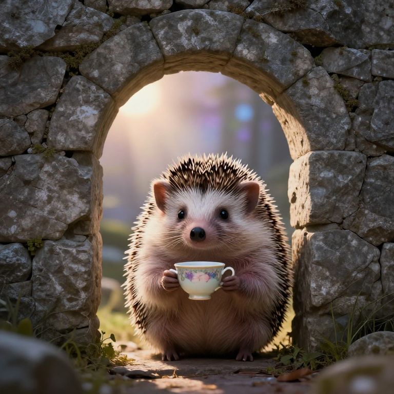 Photograph of an adorable hedgehog with a round face, small black eyes, and white and brown spiky fur, standing in a stone archway. The hedgehog holds a delicate, floral-patterned teacup with both paws. The stone archway has a rough, textured gray stone surface with sunlight streaming through, creating a bright, soft glow in the background. The hedgehog's expression is curious and cute, and the overall scene has a whimsical, fairy-tale-like quality with a mix of natural light and shadow. The background is slightly blurred, emphasizing the hedgehog and the teacup.