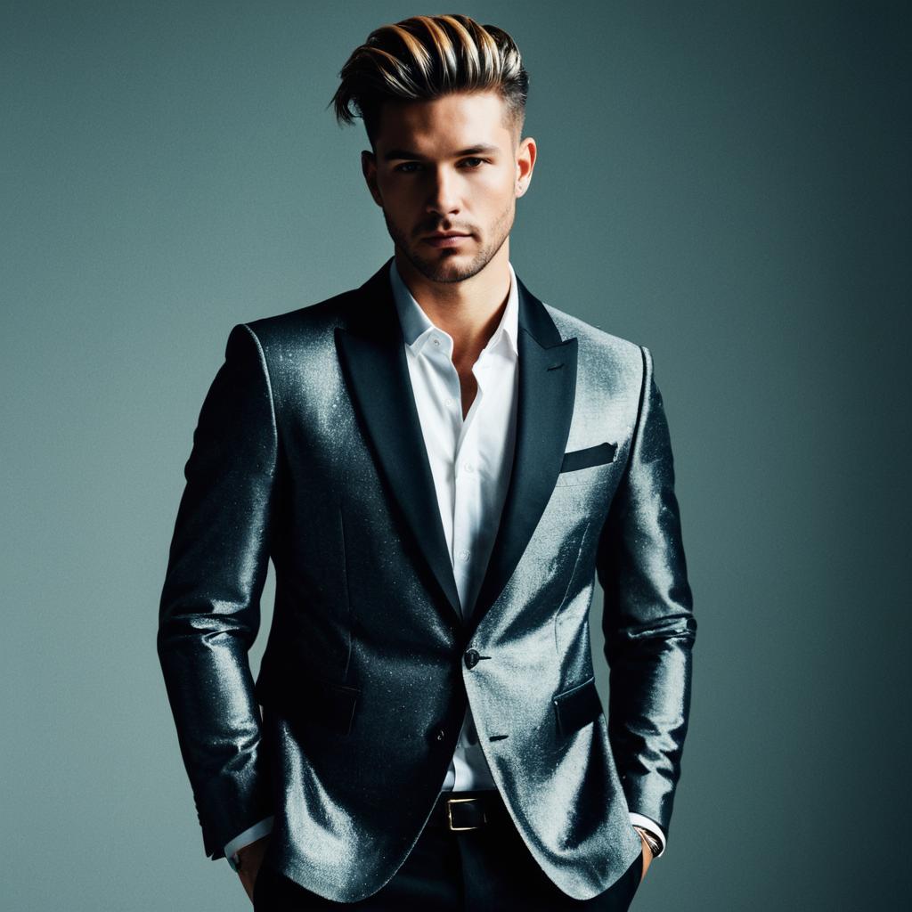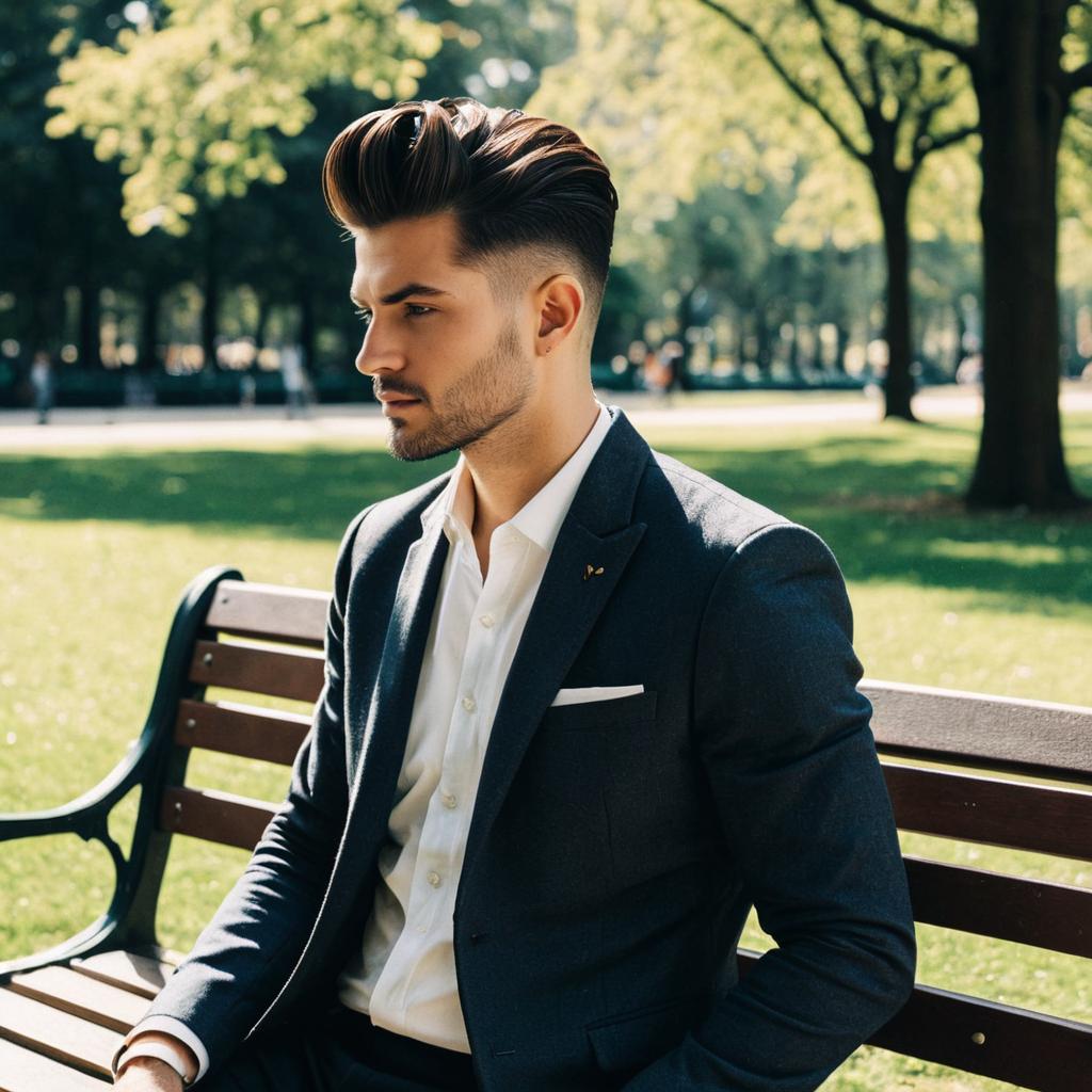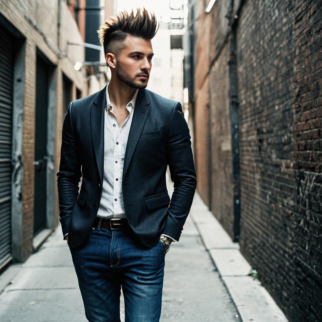 Textured Faux Hawk hairstyle on male model, wearing sleek suit, in urban street, captured in fashion editorial style with natural daylight.