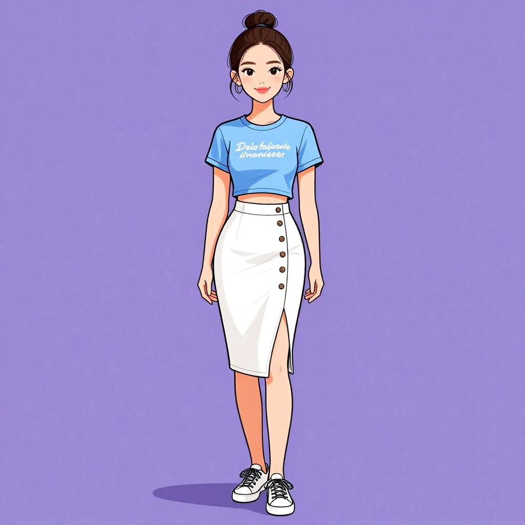Digital drawing of a young woman standing against a solid purple background. She has light skin, dark brown hair in a bun, and wears a light blue, short-sleeved crop top with white text. Her white, high-waisted, knee-length skirt has three black buttons on the right side and a slanted seam on the left. She wears white sneakers with black laces and a subtle shadow beneath her feet. Her expression is neutral, and she stands with her arms relaxed at her sides. The art style is clean, with bold outlines and flat colors.