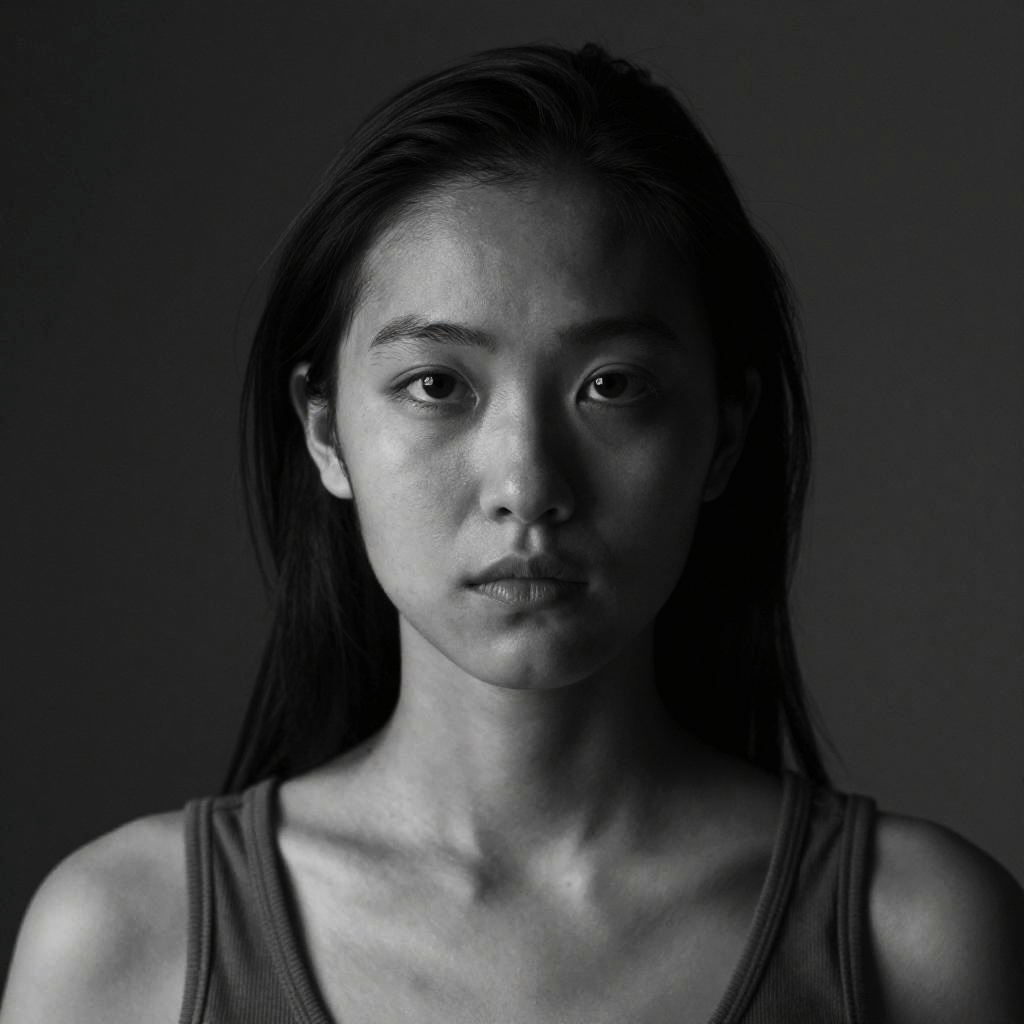 Photograph of an Asian woman with long, straight black hair, gazing directly at the camera. Her face is illuminated from the front, casting shadows on either side. She has a medium skin tone, almond-shaped eyes, and a neutral expression. She is wearing a simple, sleeveless tank top. The background is dark and unobtrusive, making her the focal point. The image is in monochromatic blue tones, giving it a dramatic, almost haunting atmosphere. The lighting highlights the texture of her skin and the subtle contours of her face.