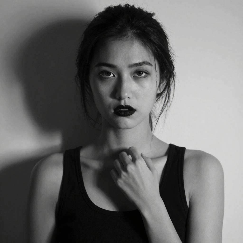 This is a high-contrast black and white photograph of a young woman with a serious expression. She has dark, straight hair pulled back, and is wearing a sleeveless top. Her face is centered, with soft shadows highlighting her features and a slightly blurred background. The image has a grainy texture, adding a dramatic, almost moody feel.