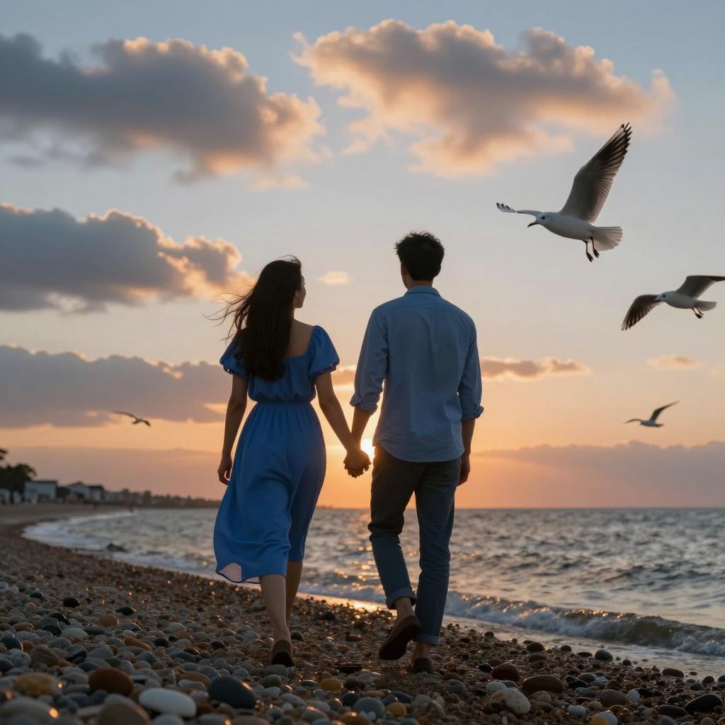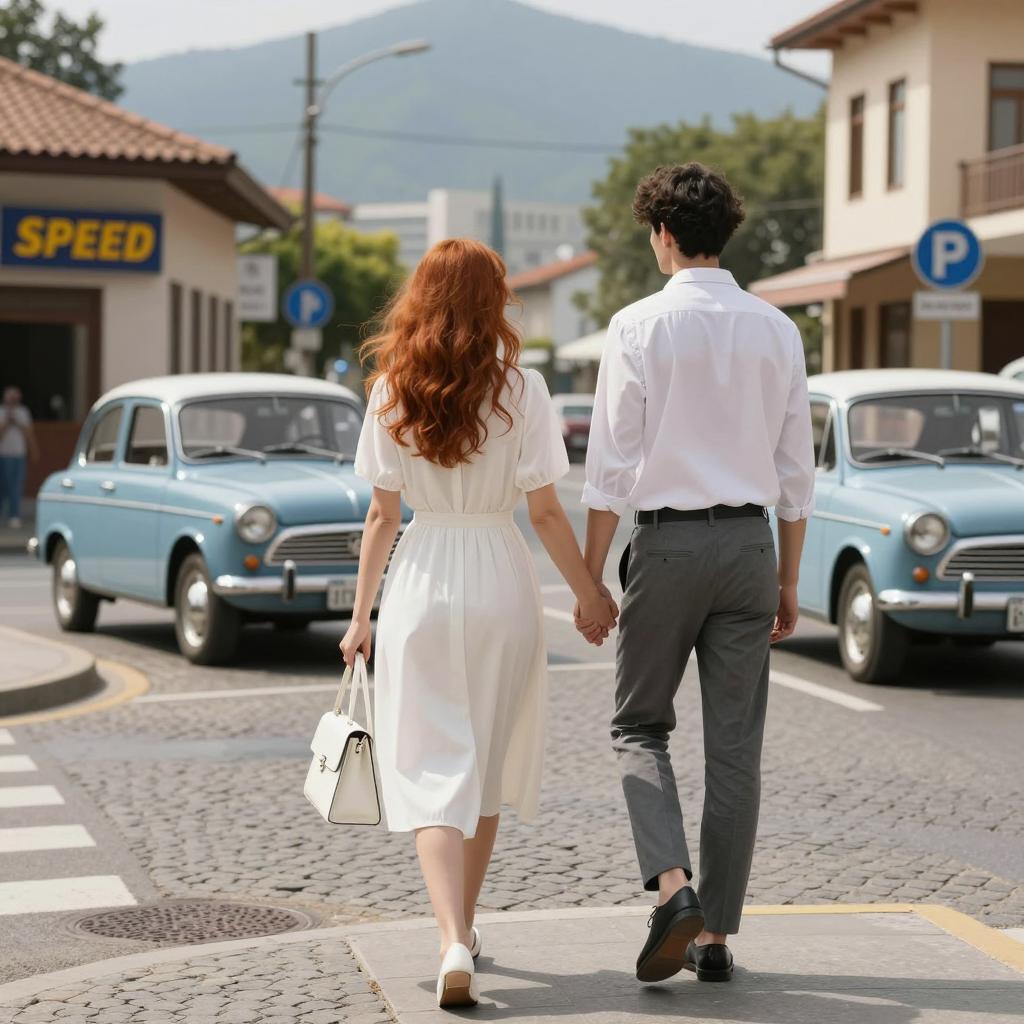 A man and woman walking hand in hand on a street corner. The woman has red hair, wears a white short-sleeve dress, white shoes, and carries a white handbag. The man has dark hair, wears a white shirt, grey pants, and black shoes. They are on a cobblestone street with vintage cars, including a blue car and a light blue car, in the background. A building with a "Speed" sign and a traffic sign are visible. Mountains are in the distant background.