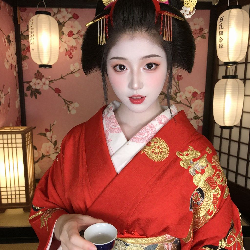 Photograph of a beautiful Asian woman in a red kimono with gold embroidery, traditional Japanese hairpins, holding a teacup, illuminated by paper