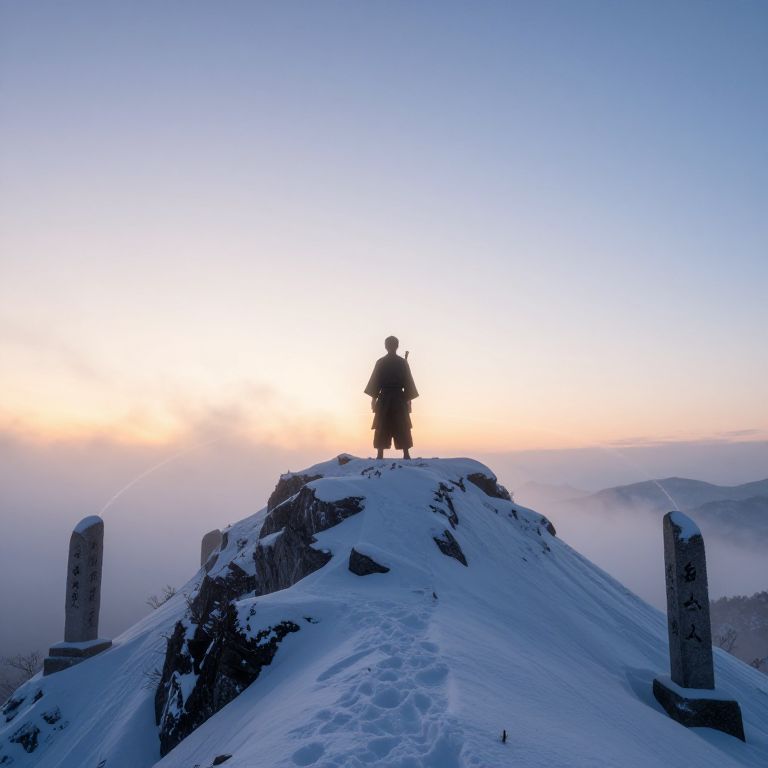 Hokuro Ryuuseigun standing atop a snowy mountain peak at dawn, with mist rising around ancient stone pillars and glowing chakra trails in the air, inspired by Japanese folklore and mystical martial arts aesthetics.