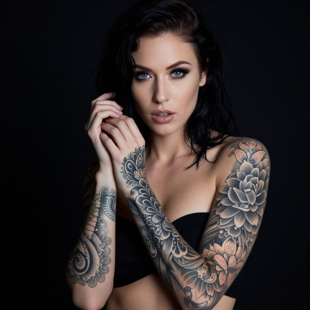 Photograph of a fair-skinned woman with dark, wavy hair and striking blue eyes. She's heavily tattooed with intricate black and grey floral designs covering her arms and shoulders. She's wearing a black strapless top and has her hands delicately clasped near her face. The background is completely black, making her tattoos and expression stand out dramatically. The lighting highlights her tattoos and face, giving a moody, edgy vibe.