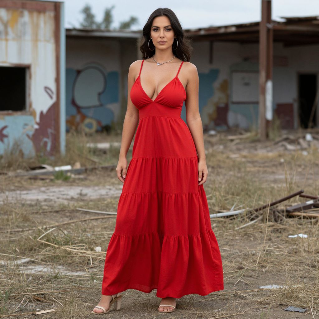 Photograph of a dark-haired woman with olive skin standing in a dilapidated, graffiti-covered, abandoned building yard. She wears a vibrant, deep-red, V-neck, sleeveless maxi dress with a flowing, layered skirt, and strappy, nude-colored sandals. Her dress accentuates her ample cleavage and hourglass figure. She has a neutral expression, dark makeup, and wears large hoop earrings. The background features rusted metal, broken concrete, and overgrown grass, with graffiti in blue, red, and yellow on the walls. The sky is overcast, adding a somber tone to the scene. The woman is centered in the frame, looking directly at the camera.
