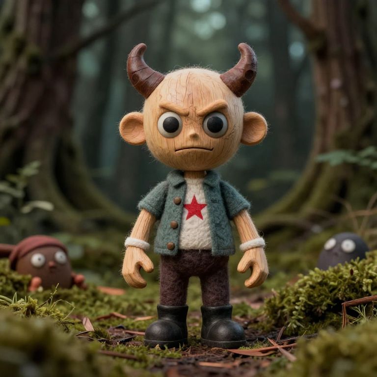 Photograph of a small, plush toy figurine standing in a forest. The figurine has a bald, wooden head with two brown, curved horns, large black eyes, and a frown. It wears a blue, textured jacket with buttons, a white shirt with a red star, dark brown pants, and black boots. The forest background is blurry with dark green trees and moss-covered ground. Two smaller, similar plush toys with round, white eyes are positioned in the foreground on the left and right. The overall scene has a whimsical, fantasy-like atmosphere.