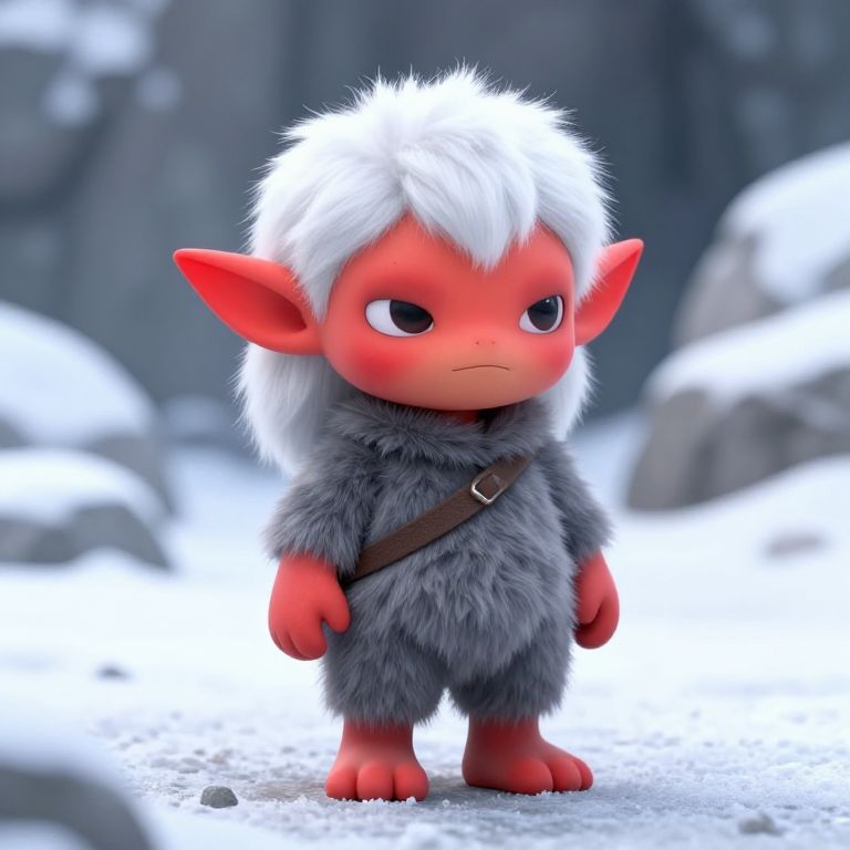 Photograph of a small, plush doll with bald head, brown horns, angry expression, red star shirt, blue jacket, standing in a mossy