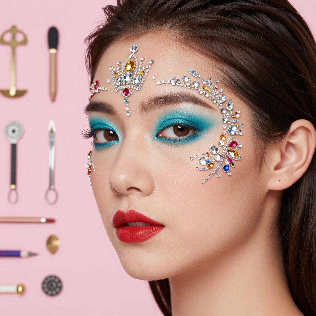 A glamorous close-up showcases a woman adorned with intricate glitter face jewelry stickers, featuring sparkling rhinestone flash tattoos in elegant crown and floral designs, complemented by vibrant teal eyeshadow and bold red lipstick, set against a soft pink background with a detailed display of additional temporary tattoo tools in various shapes and sizes.