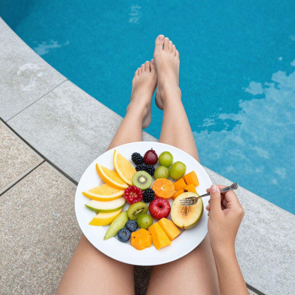 Photograph of a person's legs by a blue pool, holding a white plate of colorful fresh fruit, including kiwi, strawberries, and citrus,